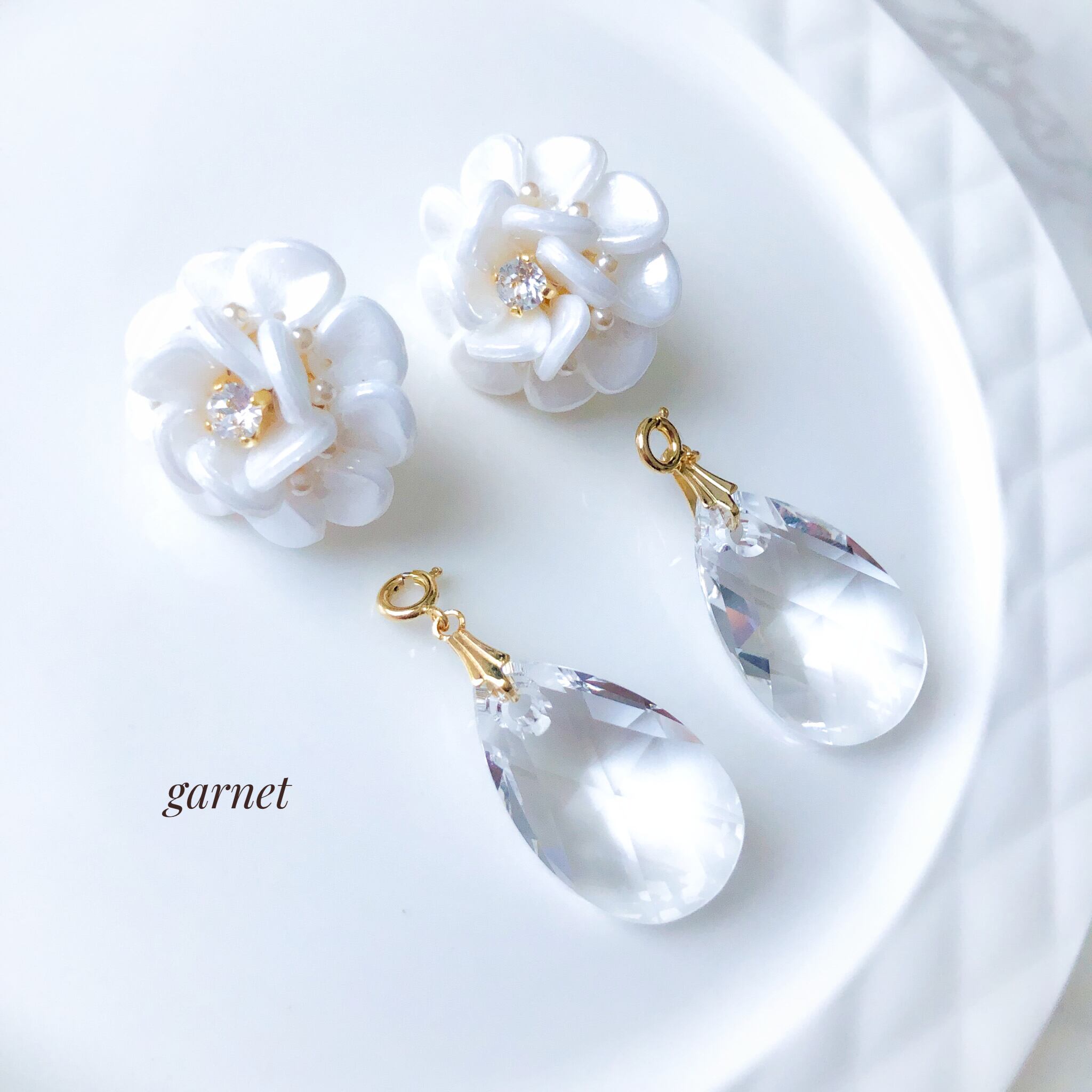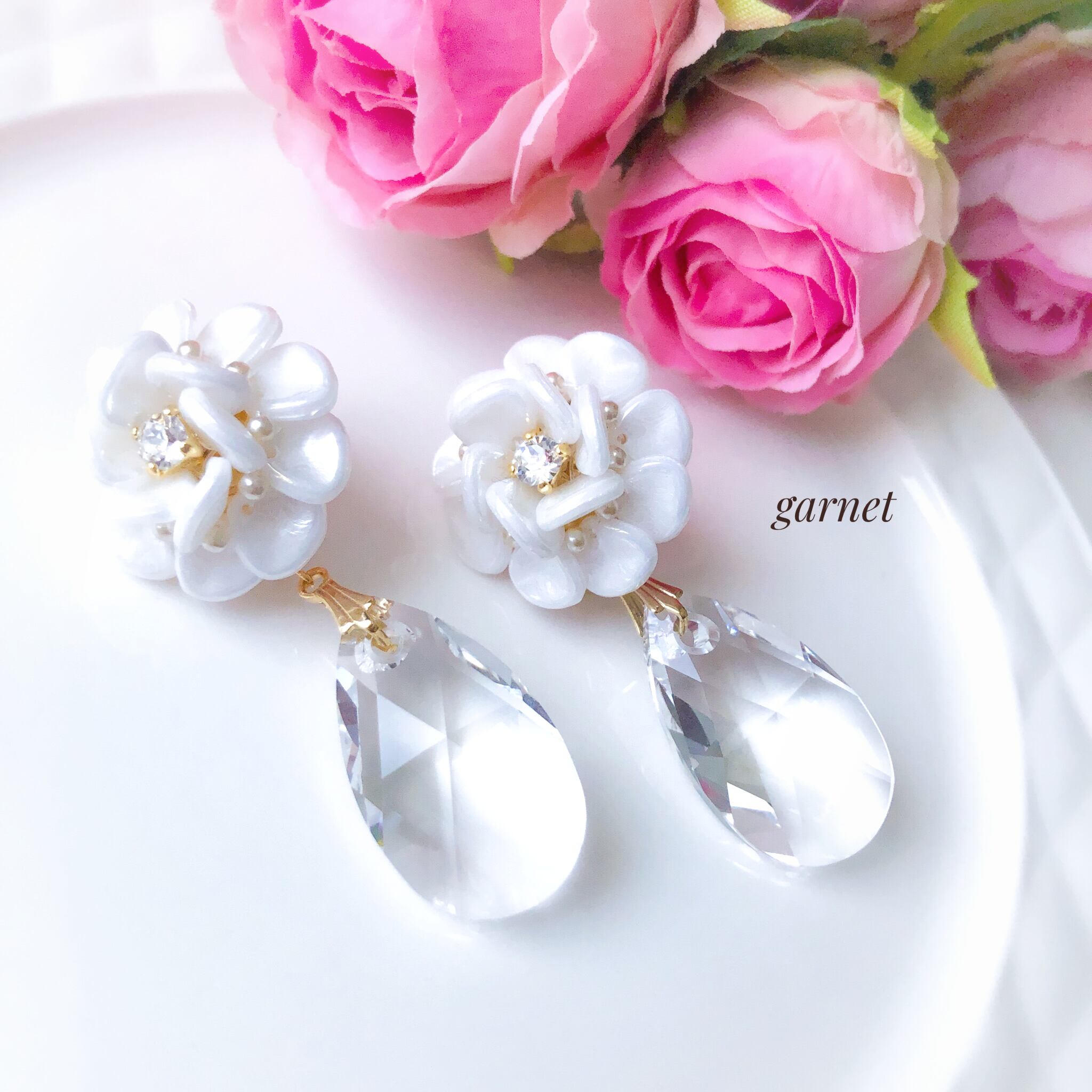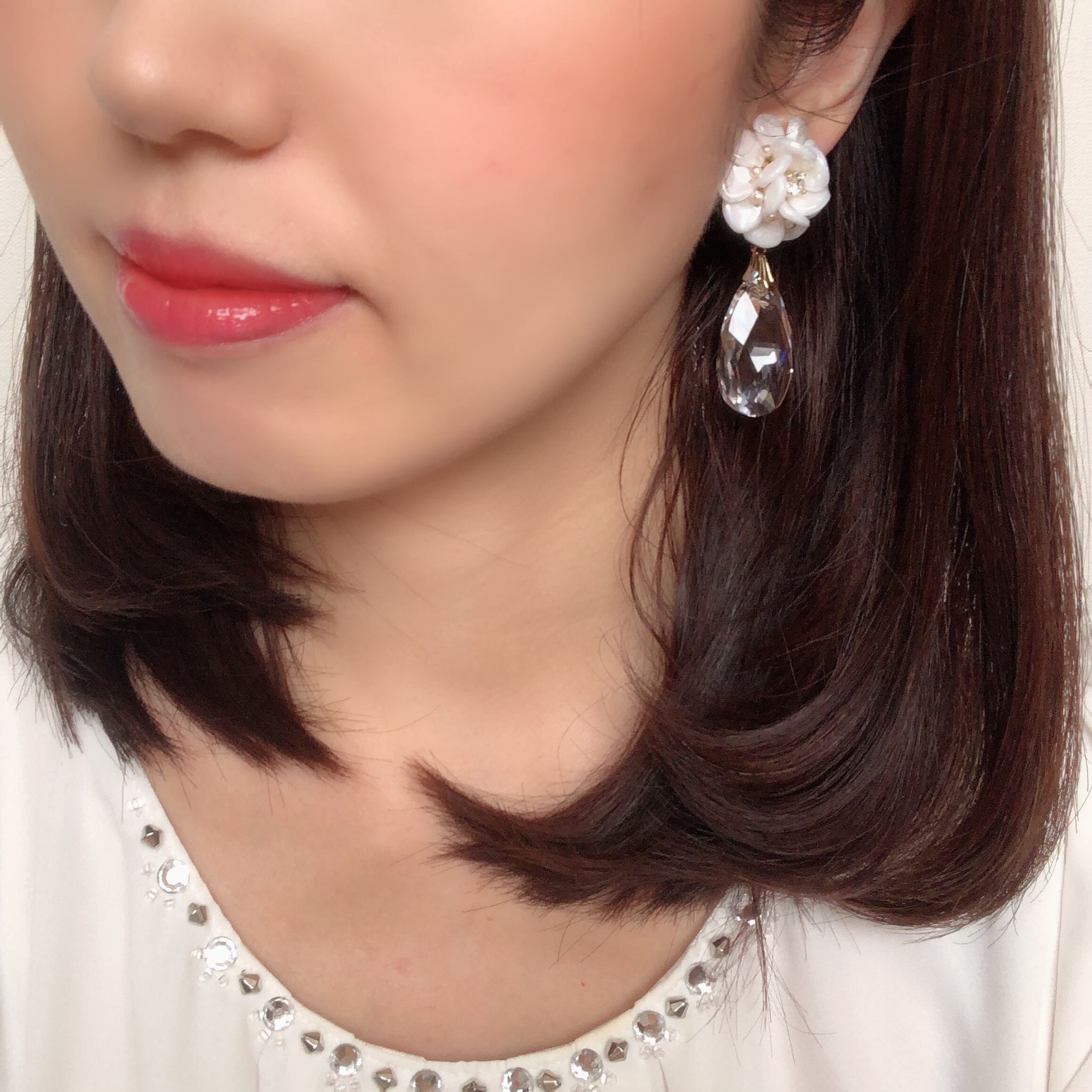 【2way】ホワイトフラワーとクリスタルビーズ ピアス/イヤリング (クリスタル)203