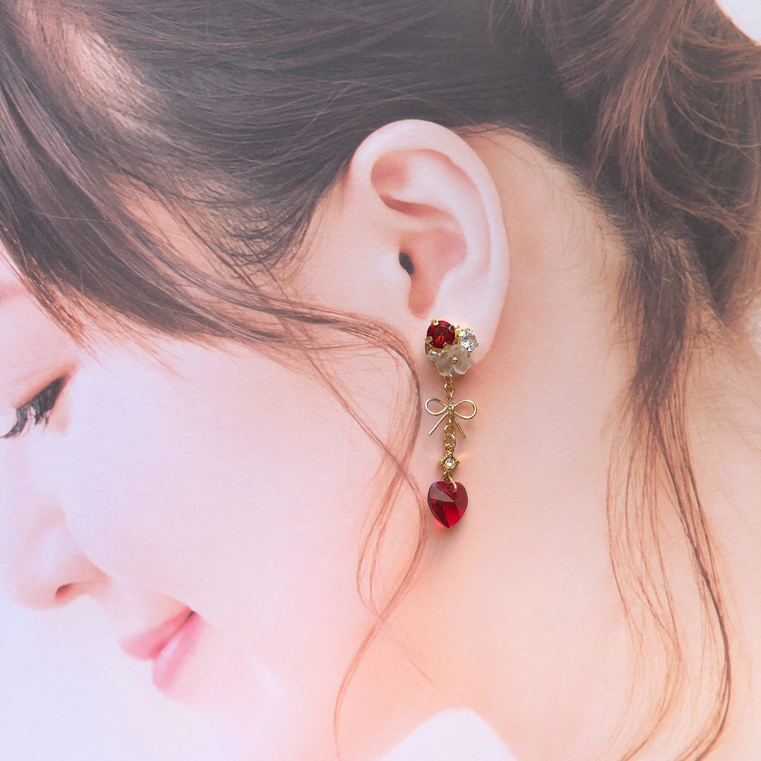 ビジューとお花とリボンハートピアス/イヤリング 赤 230