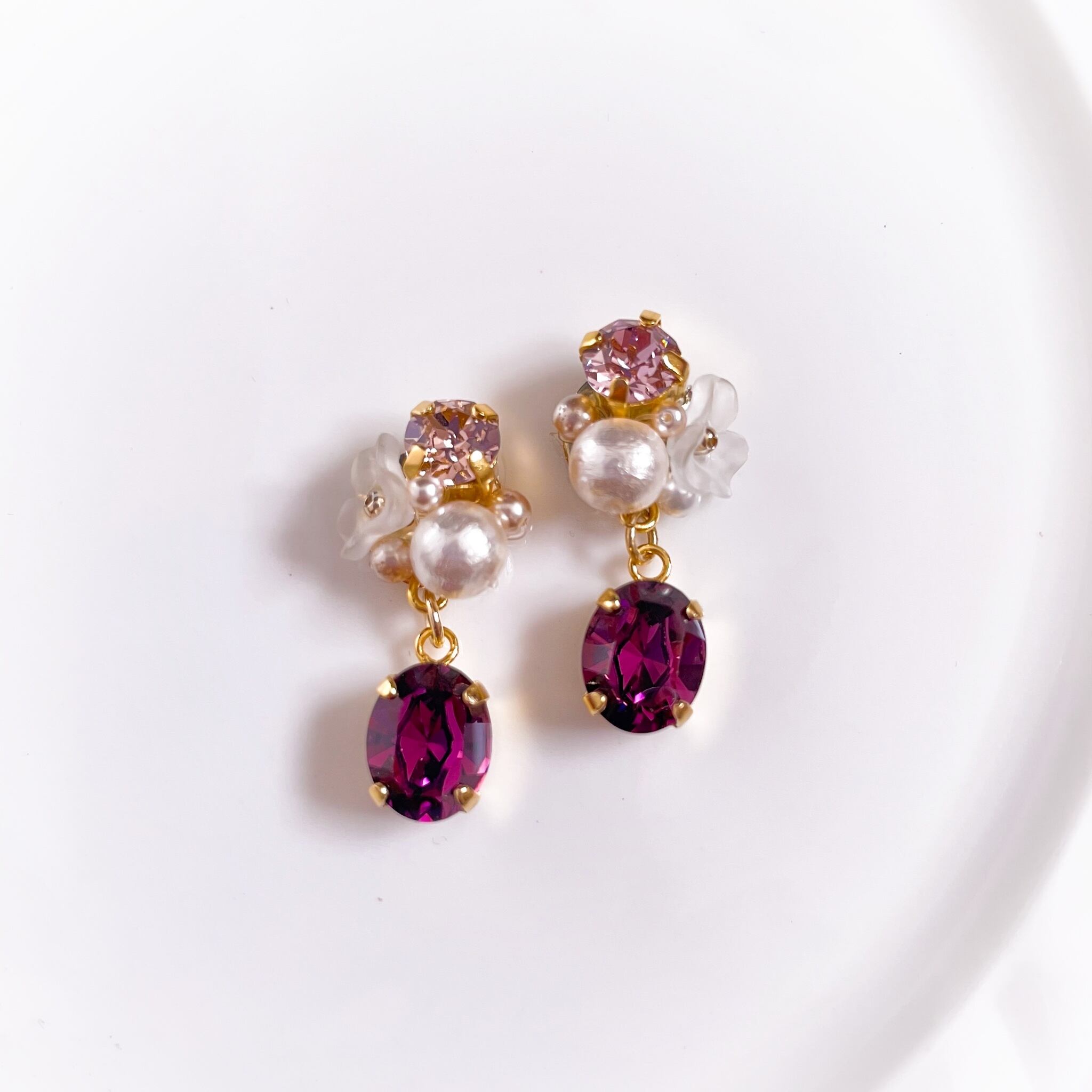 お花と楕円ビジュー アメジスト プチサイズ ピアス/イヤリング 272